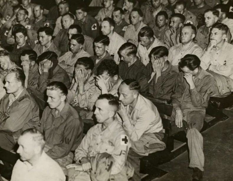 Fotografía tomada en 1945 en la que se muestra la reacción de varios prisioneros del ejército alemán durante la proyección de imágenes sobre campos de concentración. Se pueden observar personas tapándose sus caras con las manos y no miran la pantalla de frente con sus ojos.