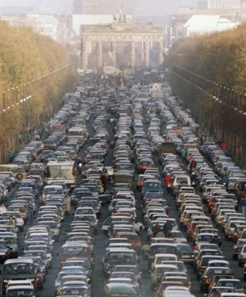 Atasco en la ciudad alemana de Berlín junto a la Puerta de Brandenburgo. Por primera vez desde la caída del Muro en 1989, los alemanes del oeste y del este finalmente pudieron cruzar de un lado a otro en total libertad.