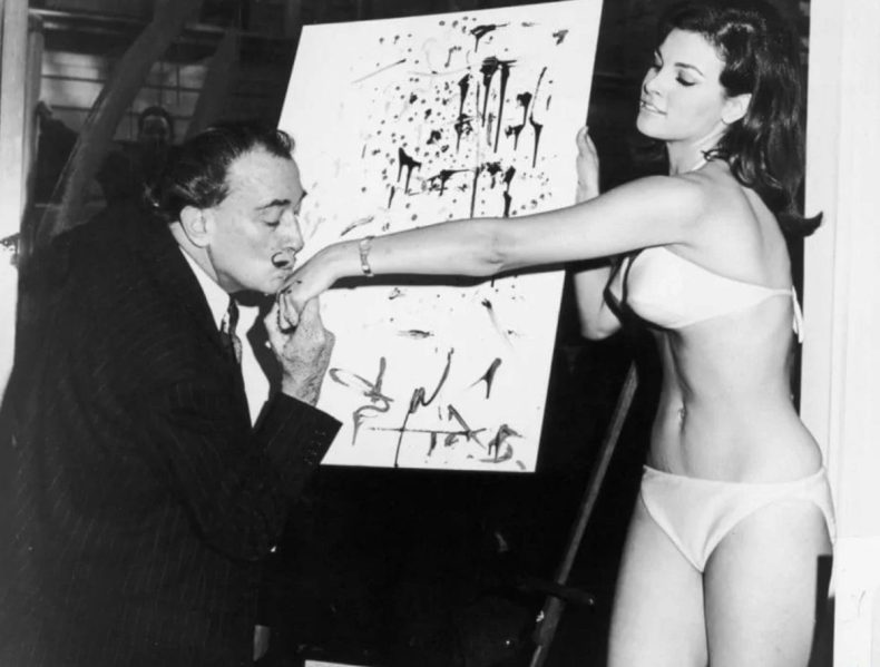 El pintor surrealista español Salvador Dali besa la mano de Raquel Welch después de que posara para un retrato.