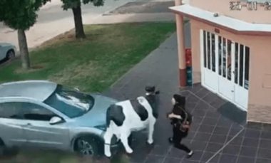 Una vaca de adorno salva a una mujer de ser arrollada frente a una carnicería