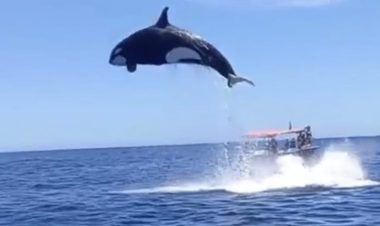 El impresionante salto de una orca intentando cazar un delfín al vuelo