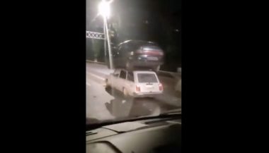 Graban un coche circulando sobre otro en una carretera rusa