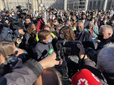 Ayuso y Almeida, ovacionados a su llegada, se saludan frente a la catedral de la Almudena
