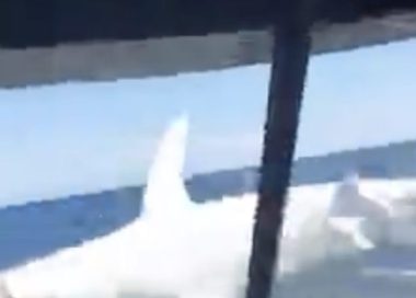 Susto a bordo: un tiburón salta del agua y cae en la proa de un barco