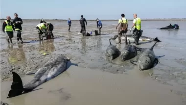 Salvan a 17 delfines varados en una playa de Francia