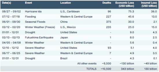 El informe revela un total de 343.000 millones de dólares en pérdidas económicas en 2021, de los cuales 329.000 millones se debieron a fenómenos meteorológicos y climáticos, lo que convierte al año pasado en el tercero más costoso del que se tiene constancia una vez ajustada la inflación. Aunque las pérdidas aumentaron con respecto a 2020, el número de catástrofes notables disminuyó ligeramente, lo que demuestra el aumento del coste y la gravedad de estos sucesos. De los siniestros de 2021, sólo el 38% estaban cubiertos por el seguro. A pesar del aumento de las pérdidas globales con respecto a 2020, la brecha de protección de las pérdidas económicas no cubiertas por el seguro disminuyó del 63% al 62% en 2021.