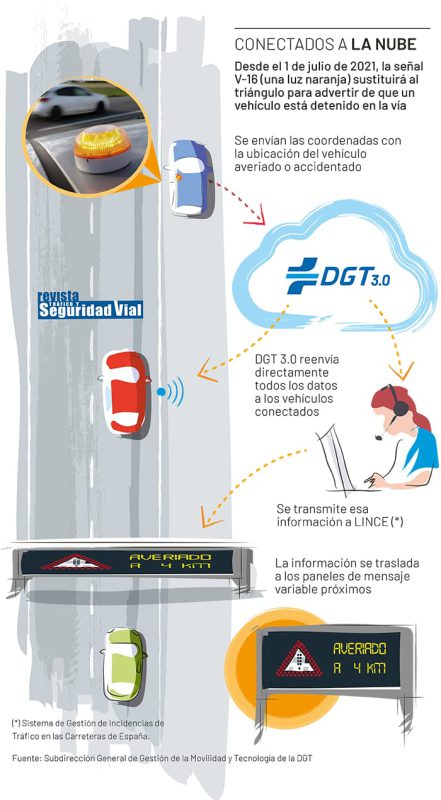 El dispositivo incorpora un sistema de geolocalización que, una vez activado, envía cada 100 segundos la ubicación del vehículo detenido a la nube DGT 3.0, para que esa información llegue a los demás conductores .