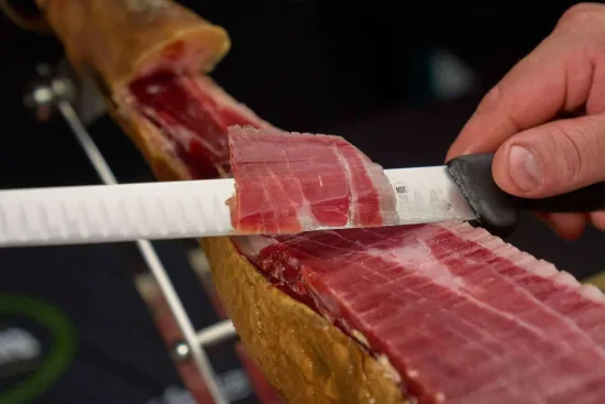 Los expertos de esta empresa señalan que, para consumir el jamón, es conveniente tener presentes ciertos factores que son determinantes para el sabor, el aroma y la textura del producto. En este sentido, es recomendable que el jamón esté a una temperatura ambiente de entre 22° y 27°. Además, se debe cortar con cuchillo siguiendo el vetado y las fibras de la pieza. Idealmente, las lonchas deben ser finas para que la grasa se funda en el paladar y el sabor se refuerce. Si el corte resulta demasiado grueso esta sensación se pierde.