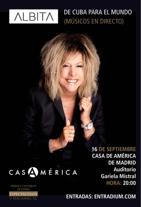 Albita, basta solo mencionar su nombre para saber de quién hablamos, ofrecerá un concierto en la Sala Gabriela Mistral de Casa de América el 16 de este mes de septiembre, a las 20:00 horas, 8 de la tarde.