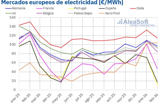 AleaSoft Energy Forecasting, 3 de marzo de 2026. En febrero, los precios mensuales de la mayoría de los principales mercados eléctricos europeos descendieron, con la excepción del mercado nórdico. Varios registraron su promedio mensual más bajo de los últimos meses, destacando el mercado portugués, que alcanzó el precio más bajo de su historia en el mercado ibérico MIBEL. La caída de los precios del gas y del CO2, estos últimos con el promedio mensual más bajo desde septiembre, junto con el descenso de la demanda respecto a enero en la mayoría de los mercados, favoreció esta tendencia. En algunos casos, el aumento de la producción renovable también contribuyó a las bajadas. Francia, Italia y Portugal registraron la mayor producción eólica de su historia para un mes de febrero, algo que también ocurrió con la fotovoltaica en Italia. Los futuros de Brent alcanzaron el promedio mensual más alto desde agosto.