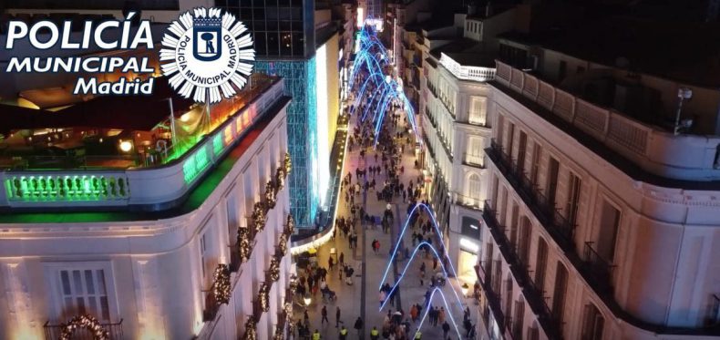 Desde el viernes y hasta el 7 de enero, un dispositivo de Policía Municipal controla los aforos de las distintas zonas desde las azoteas de distintos edificios del Centro de Madrid y con los drones de la Unidad de Apoyo Aéreo, realizando controles de acceso a las zonas más concurridas.