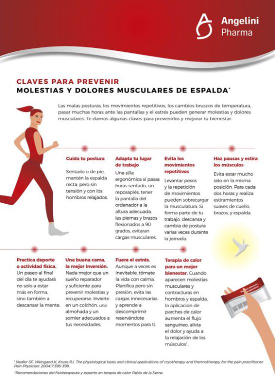 Las malas posturas, los movimientos repetitivos, los cambios bruscos de temperatura, pasar muchas horas ante las pantallas y el estrés, entre otros factores, pueden generar molestias y dolores musculares de espalda. Angelini Pharma, de la mano del fisioterapeuta y experto en terapia de calor Pablo de la Serna, propone algunas claves para prevenirlos y mejorar el bienestar en la rutina diaria
