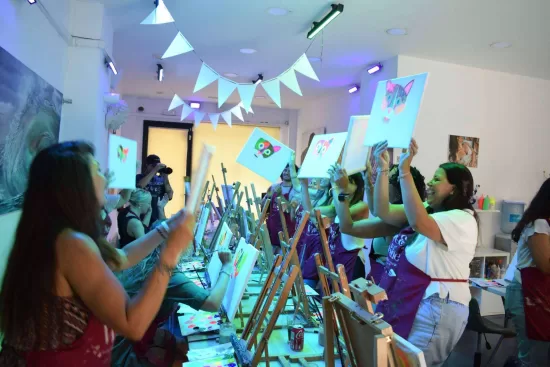 Al contratar la experiencia, el artista ofrece diferentes temáticas y técnicas pictóricas, de allí se puede seleccionar el modelo preferido y el día de la celebración le dan acceso a una sala completa con todo lo necesario para pintar.