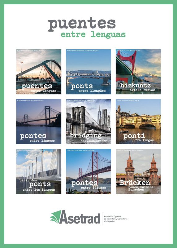 Bajo el lema ‘Puentes entre lenguas’ y con diversas actividades programadas, Asetrad quiere impulsar el reconocimiento de los traductores, correctores e intérpretes como enlaces entre lenguas y culturas. Los tres gremios son piezas claves en la construcción de puentes para el entendimiento y la transmisión del conocimiento, la cultura y la información