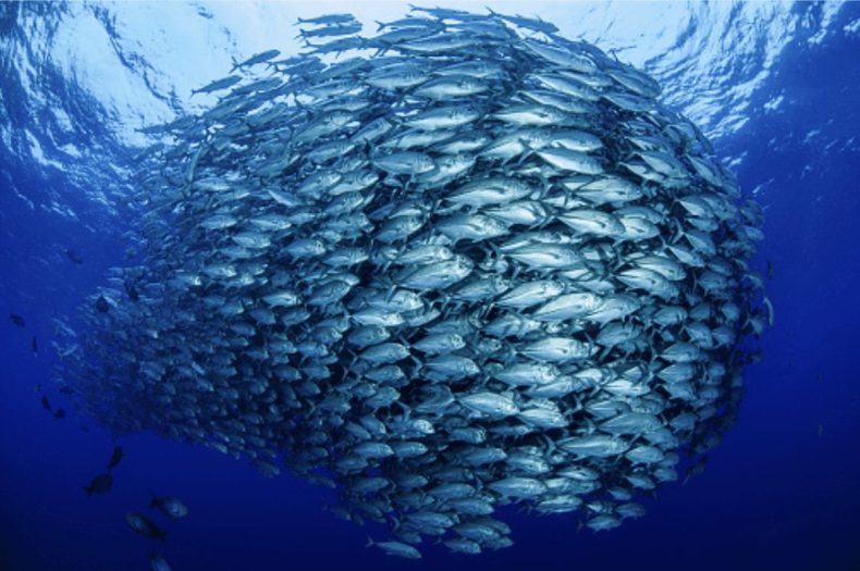 En las imágenes se puede apreciar cómo un tiburón ataca un banco de peces en busca de alimento, momento en el que comienza una hipnótica danza acompasada al son del mar.
