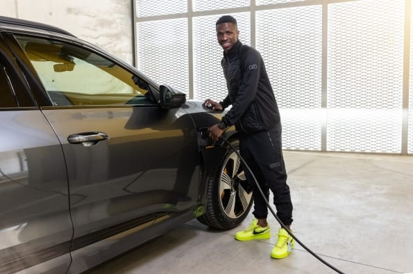 Raphael Varane y Vinícius Junior demuestran su pasión por la sostenibilidad y ambos han escogido para esta temporada el nuevo Audi e-tron Sportback 55 quattro. El defensa francés ya pudo comprobar el pasado año todas las ventajas de la movilidad eléctrica conduciendo un e-tron quattro, mientras que para Vinícius será una nueva experiencia, tras haberse movido los últimos meses a bordo de un A7 Sportback. El SUV eléctrico con carrocería coupé, en su versión 55 quattro, ofrece una potencia máxima de sistema que alcanza los 300 kW (408 CV) en modo boost, y una autonomía de hasta 446 km.