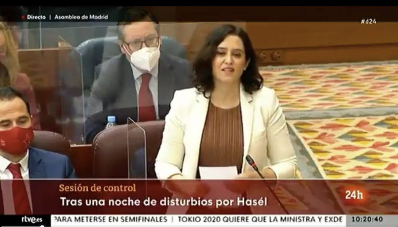 La presidenta de la Comunidad de Madrid, Isabel Díaz Ayuso, acusó este jueves en el Pleno parlamentario a Podemos por “jalear la fiesta de niñatos que se manifiestan por un delincuente que tiene menos arte que cualquiera de los que estamos aquí con dos cubatas en un karaoke”, refiriéndose al rapero Pablo Hasél.