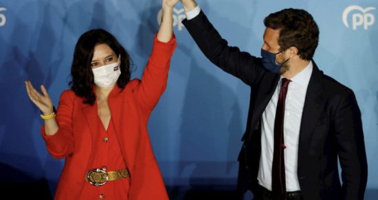 La presidenta de la Comunidad de Madrid y candidata del PP a la reelección Isabel Díaz Ayuso, y el presidente del PP, Pablo Casado, celebran juntos desde el balcón instalado en la sede del partido, en la calle Génova, la victoria electoral en Madrid.