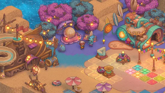 Los gráficos pixelart del juego parecen simples al principio, pero los entornos son bastante complejos. Algunas zonas tienen iluminación 3D, por ejemplo. Otras, tienen colores brillantes de estilo otoñal, con islas flotantes conectadas por puentes de teclas de piano. Otros son más pálidos y pastel. Todo es acogedor, y a la vez no pierde la esencia del reino de magia y hadas que es Bandle. Por último, encontramos guiños a personajes de League of Legends, como el castillo oscuro y tenebroso del mago Veigar.