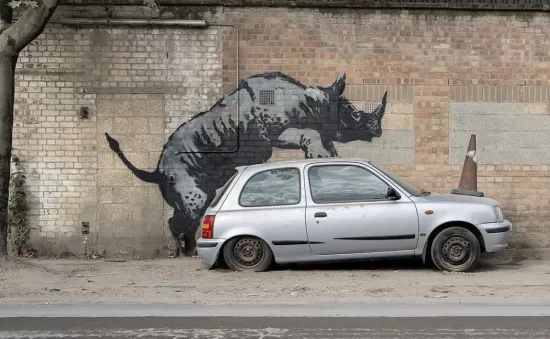 Los murales, que él mismo va publicando en su perfil de Instagram, ascienden a ocho y el último ha sido la figura de un rinoceronte en una pared que simula escalar un coche aparcado justo delante.