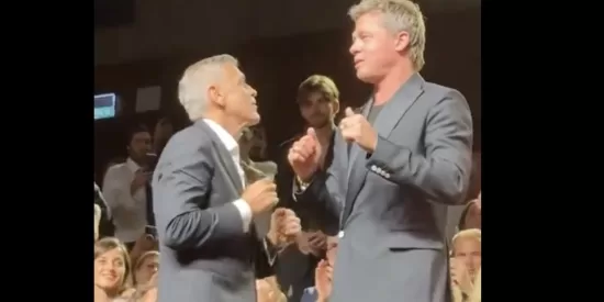 Brad Pitt and George Clooney embrace during warm nearly 5-minute #Venezia81 standing ovation for Apple’s “Wolfs” as Brad dances and sings along to Sade’s Smooth Operator. It was such an electric (insane?) night inside Sala Grande with two of Hollywood’s biggest movie stars in the… pic.twitter.com/qZXYxRfH53