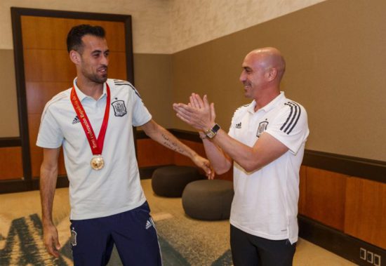 El capitán de la selección española de fútbol Sergio Busquets ha sido reconocido por la Real Federación Española de Fútbol (RFEF) por alcanzar los 100 partidos con España, en un acto en el que el presidente de dicho organismo, Luis Rubiales, ha premiado a los últimos debutantes con el combinado nacional.