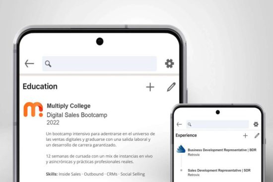 Paula explica que “la gran repercusión y el motivo por el cual las personas se animan a pensar seriamente en un cambio de carrera se debe principalmente a dos motivos”. Por un lado, Multiply College diseñó un acuerdo pago a éxito, un modelo de financiamiento que permite a quienes participan acceder a la formación sin coste inicial. “Tras terminar el curso y la práctica profesional ayudamos a los graduados a conseguir su primer empleo en Digital Sales. Recién ahí, con los honorarios o salario, se comienza a pagar el curso en cuotas. Esto derriba una de las grandes barreras que tienen las personas a la hora de formarse para empezar una nueva carrera”.