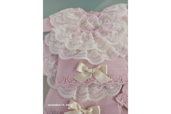 La firma es reconocida por sus toquillas, faldones de bautizo y canastillas, elementos fundamentales en ceremonias familiares y primeras puestas. Estas piezas no solo visten al bebé, sino que representan un vínculo con la tradición de la “canastilla española”, hoy reinterpretada con un enfoque contemporáneo.