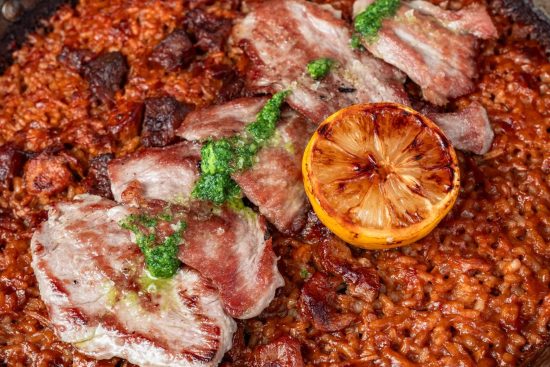 Junto a ella, la paella campera con pollo y presa representa un homenaje a la cocina de la tierra. En esta versión, los vegetales de temporada se integran con carnes seleccionadas para crear un plato que une tradición y sabor. La cazuela de arroz con pollo y presa completa la propuesta, manteniendo la esencia de la cocina mediterránea en cada bocado.