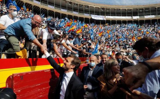 «Gracias a los que no habéis podido entrar. Se han desbordado las previsiones. El PP vuelve a llenar la plaza de toros de Valencia», ha proclamado Casado a las puertas del coso, desde donde ha querido saludar a los militantes del partido que se han quedado en la calle por las limitaciones de aforo.