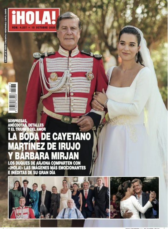 ¡Hola! ofrece una foto en primer plano de Cayetano Martínez de Irujo y Bárbara Mirjan, que lo coge del brazo como su ya esposa y ahora duquesa de Arjona. Es el único tema de portada: bajo la imagen de la pareja vemos una foto de familia con algunos de los asistentes, tales como el duque de Alba y la duquesa de Montoro, así como Tana Rivera y el duque de Huéscar. La tercera foto es de Cayetano y Bárbara bailando, él ya vestido de calle.