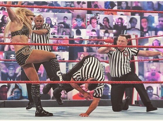 La ‘Reina’. nada más ser derrotada, comenzó a increpar al colegiado por lo rápido que había hecho el conteo. Al principio todo se quedo en palabras, sin embargo al rato la luchadora comenzó a cargar violentamente contra el colegiado, que tuvo que ser rescatado por varios de sus compañeros. Incluso cuando ya parecían haber tranquilizado a Charlotte Flair, ella volvió a cargar contra el referí, que agonizaba en el ring.