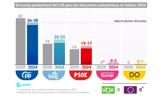 Además, conforme a los datos del CIS, Sumar podría quedarse fuera del Parlamento gallego, con un 3,5% de los votos y entre 0 a 2 escaños. Podemos y Vox se quedarían sin representación parlamentaria y sí podría obtener un escaño Democracia Ourensana por la provincia de Ourense.