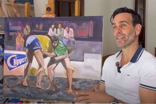 El actor y artista Ciro Miró, inspirado por la nobleza y la fuerza simbólica de la Lucha Canaria durante el rodaje de la serie Hierro, rindió homenaje a esta disciplina a través de una serie de obras visuales. La exposición ofreció una mirada profunda a la Lucha Canaria, reflejando su valor humano, su rica herencia cultural y su estética singular.