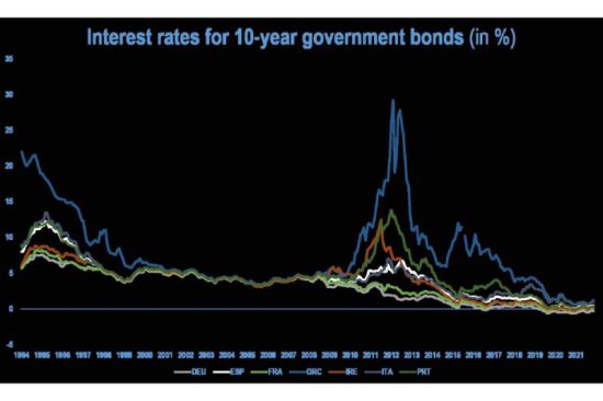 En los años 90, los tipos de interés nominales habían convergido y los diferenciales eran muy reducidos en el momento del lanzamiento del euro. Tras una década de estabilidad, los diferenciales con respecto a Alemania se dispararon tras la crisis financiera de 2008-2009 y la crisis soberana europea, momento en que los mercados empezaron a diferenciar de nuevo el riesgo de crédito entre los diferentes países europeos y se percataron de que algunos de ellos podían entrar en impago. Así, los diferenciales con respecto al Bund (bono alemán a 10 años) aumentaron hasta que el presidente del Banco Central Europeo se comprometió a «hacer lo que fuera necesario» para preservar el euro. Es importante señalar que muchos países disfrutan ahora de condiciones de financiación mucho más favorables que si no estuvieran en la Unión Económica y Monetaria.