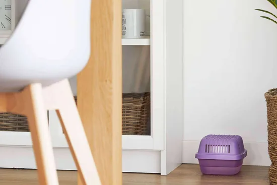 Este aparato antihumedad está compuesto por una bolsa deshumificadora de 250 g o 450 g que alberga una fórmula granulada que absorbe y retiene partículas en forma de líquido, evitando pérdidas y derrames. Esto hace que la humedad no se retenga en prendas de tela o en objetos almacenados dentro de los armarios, lo que evita su deterioro y previene la aparición de hongos, ácaros o cualquier otra alteración en el ambiente, derivadas de la condensación.