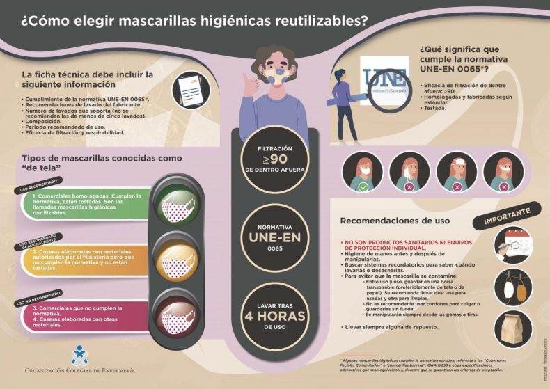 El Ministerio de Consumo ha prometido que en las próximas semanas lanzará la regulación específica para normalizar la comercialización de este tipo de mascarillas. A la espera de la regulación oficial, la Organización Colegial de Enfermería ha elaborado una infografía y un vídeo animado donde se enseña a la población en general a elegir las que más nos protejan frente al COVID-19.