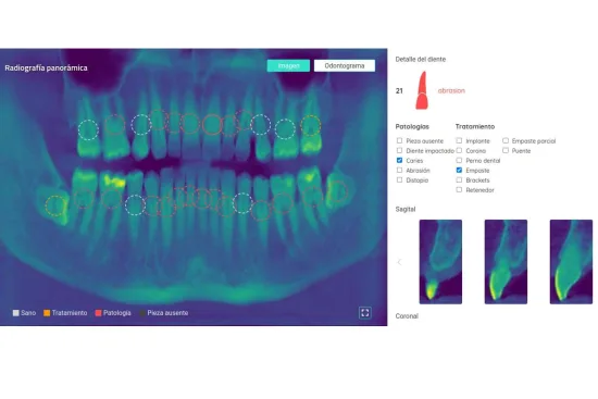 Con respecto al análisis detallado de cada pieza, Dentomo permite obtener una imagen pictográfica, numeración de cada pieza, patologías, detalles de la patología y secciones del diente. De hecho, garantiza una precisión superior al 90 % en la identificación de patologías y tratamientos previos.