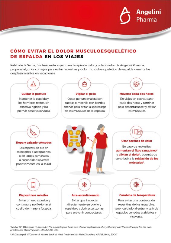 Si a pesar de tomar todas estas precauciones, aparecen molestias de espalda, los parches de calor son muy útiles durante los viajes ya que «son fáciles de colocar, muy efectivos y la mejoría se nota en poco tiempo, de manera que podremos continuar con las actividades vacacionales». De la Serna recuerda que «los parches térmicos terapéuticos aumentan el flujo sanguíneo y alivian el dolor[1], a la vez que ayudan a la relajación de los músculos[2]«.