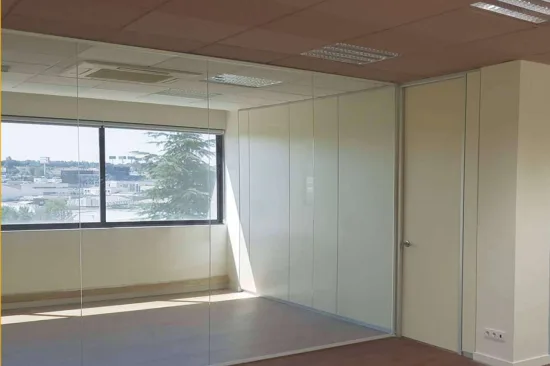 Una de las más recientes innovaciones que ha incorporado Office Deco al mercado en Madrid han sido sus mamparas de oficina con tecnología Vinile. Se trata de una lámina inteligente que se coloca sobre la superficie transparente o entre los dos cristales que conforman la mampara. Con este elemento los usuarios tienen la oportunidad de transformar la apariencia visual del habitáculo.