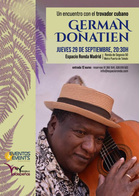 El trovador cubano Germán Donatién, ofrecerá un concierto el próximo jueves 29 de este mes de septiembre, a las 8 y media de la tarde, en el Espacio Ronda, situado en la Ronda de Segovia, nº 50, en Madrid, a precios muy populares. El concierto ha sido organizado por “Eventos y Events”, de Alexis Mendiola, y en el curso del mismo se ofrecerá a los espectadores un vino español, cortesía de Vinícola de Valdepeñas.