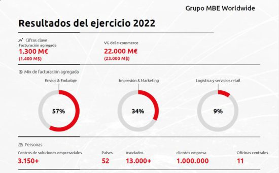 MBE cerró el año fiscal 2022 con 1.300 millones de euros (1.400 millones de dólares) de facturación agregada, generados a través de su plataforma basada en la localización, compuesta por más de 3.150 centros de soluciones en 52 países, que operan bajo diferentes marcas: PrestaShop, Mail Boxes Etc., PostNet, PACK & SEND, AlphaGraphics, Multicopy, GEL Proximity y World Options – y 22.000 millones de euros (23.000 millones de dólares) de valor bruto de la mercancía comercializada a través de su plataforma digital bajo la marca PrestaShop.