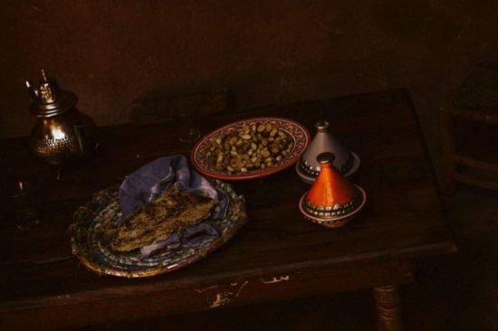 The Meal explora los detalles del espacio destinado a la preparación de un almuerzo corriente de una familia sahariana con estructuras rocosas y el color amarillo predominando en la oscuridad.