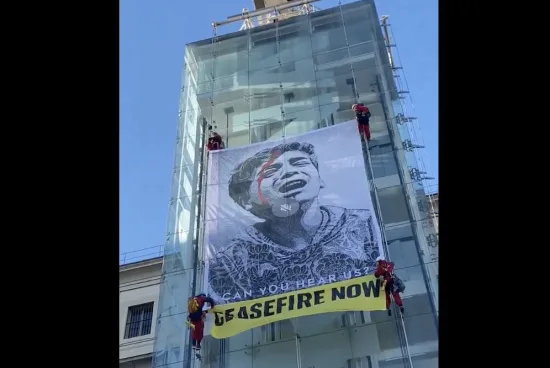Varios escaladores de Greenpeace han desplegado a primera hora de este miércoles en la fachada del Museo Reina Sofía de Madrid una ilustración del artista visual estadounidense Shepard Fairey ‘Obey’ para pedir el «alto el fuego» inmediato en Gaza.
