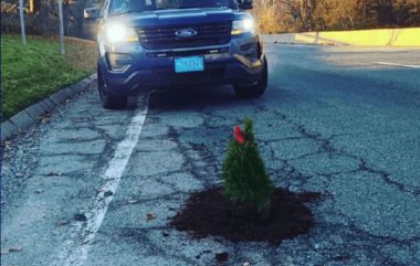 Un hombre planta árboles de Navidad en los socavones de una carretera tras haber pinchado las cuatro ruedas de su coche