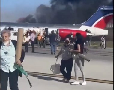 Los pasajeros de un avión en llamas demoran su salida por recoger sus pertenencias