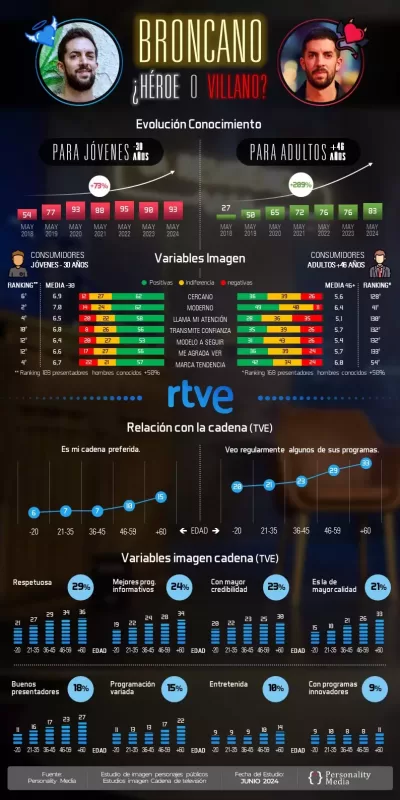 En la mayoría de las variables de imagen consultadas en el estudio, cerca de un 60% de estos jóvenes valora entre el notable y sobresaliente al presentador. Esto demuestra una gran afinidad, que se traduce en pocos detractores de tan solo el 15%.