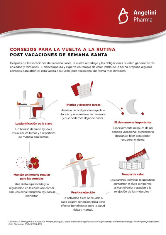 Han terminado las vacaciones de Semana Santa y la vuelta al trabajo y las obligaciones pueden generar estrés, ansiedad y tensiones. El fisioterapeuta y experto en terapia de calor Pablo de la Serna propone algunos consejos para afrontar la vuelta a la rutina post vacacional de forma más llevadera