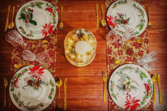 Para lograr esta combinación, se puede recurrir a diferentes objetos fáciles de conseguir, por ejemplo, Rosso Decora tiene en su catálogo unas bonitas velas doradas metalizadas por 4,20 €. Estas, en compañía del camino de mesa rojo y la maceta artificial de flor de Pascua en el medio de 2,90 €, pueden formar esa armonía entre las decoraciones y los alimentos que estarán en la mesa. La vajilla se puede acompañar de los bajo platos, por 2,30 € cada uno, los cuales darán el aire de fiesta.