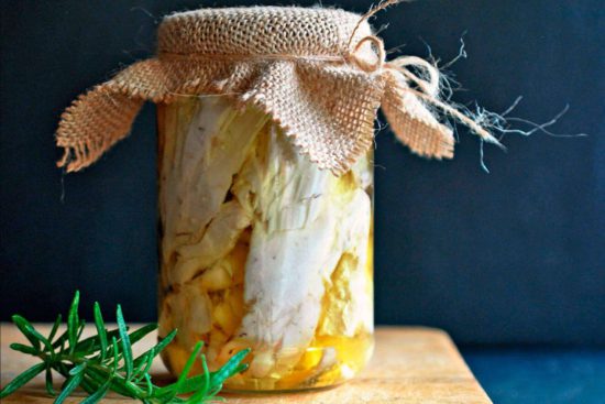Al sacar la fuente del horno se procede a retirar la piel y la espina central del pescado. La carne se coloca dentro de un bote en el que se vacía el aceite que se usó en la bandeja. Se utiliza el resto que quede en la botella para terminar de llenar el envase y se deja reposar hasta que tenga la temperatura ambiente.